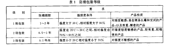 ①包裝的防潮等級(jí)應(yīng)根據(jù)產(chǎn)品的性質(zhì)、流通環(huán)境、儲(chǔ)運(yùn)時(shí)間、包裝容器的一般性能等因素來確定防潮包裝等級(jí)分為1級(jí)包裝、2級(jí)包裝、3級(jí)包裝,詳見表1